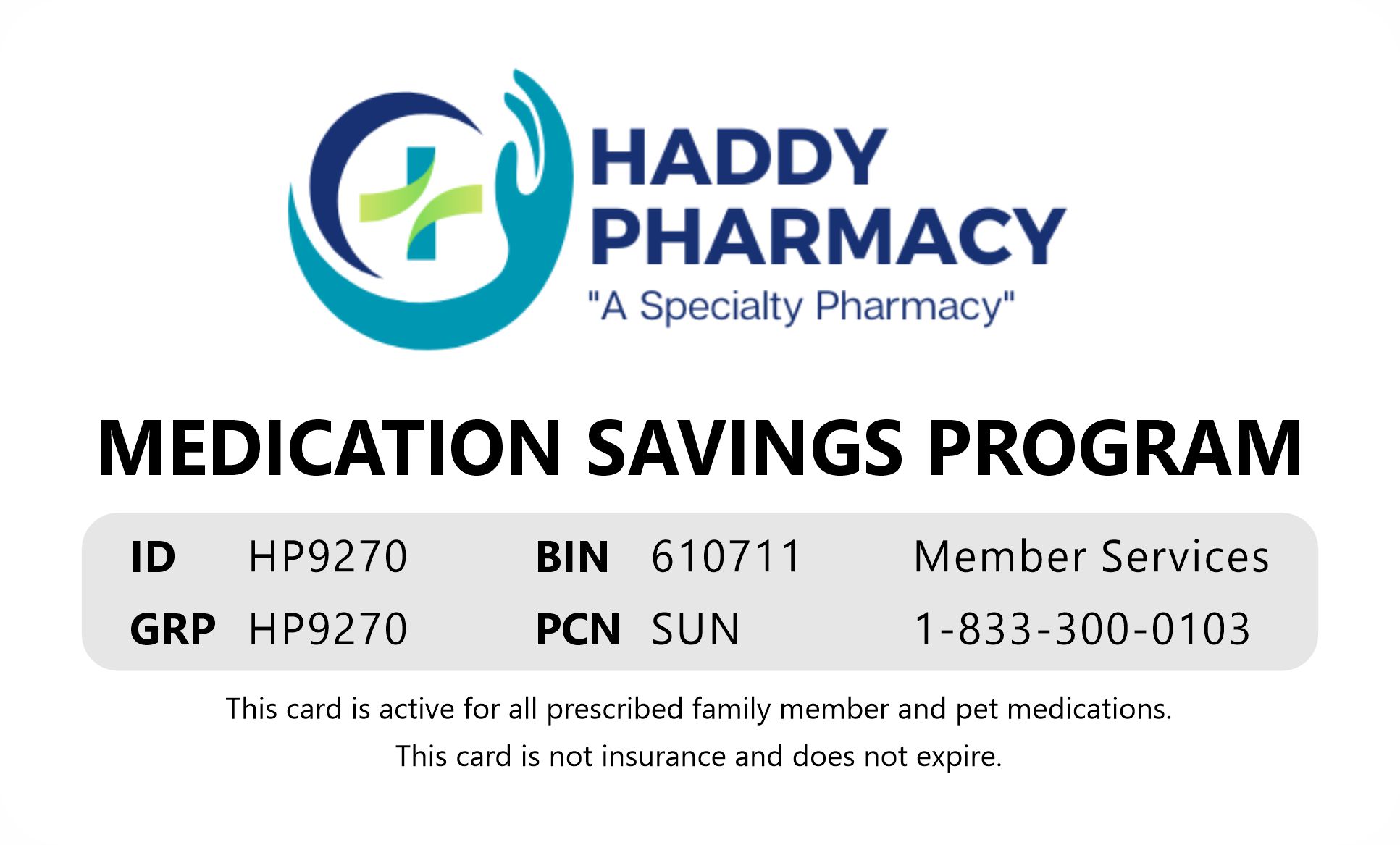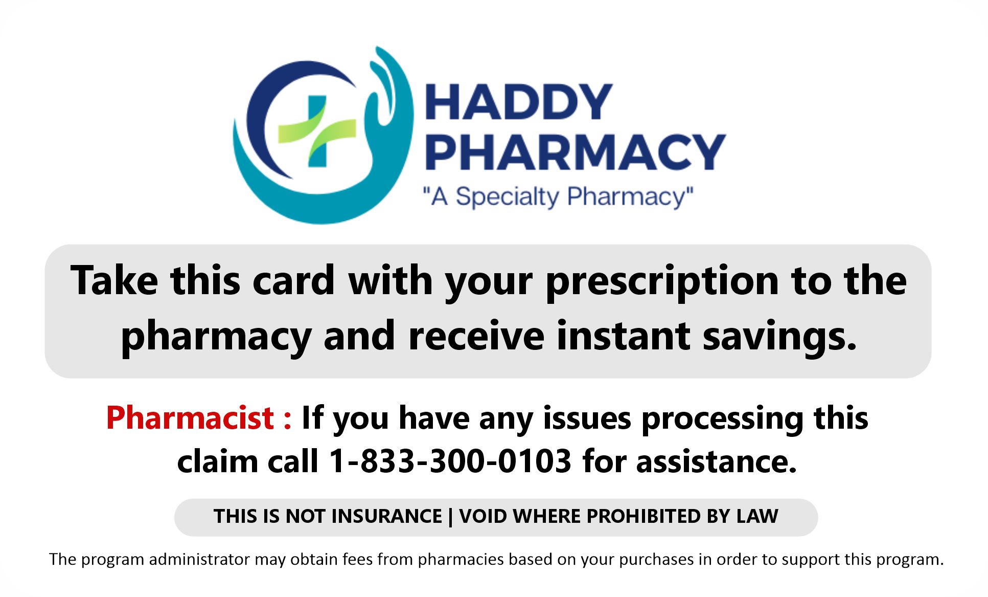 The Haddy Pharmacy medication savings program provides discounts of up to 87% off retail prices at all major chains and most independent pharmacies nationwide.
